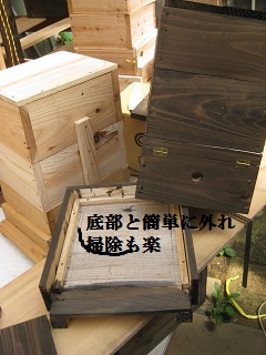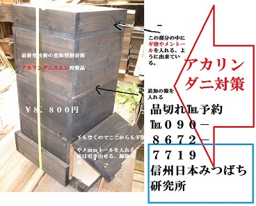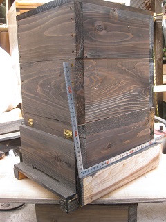 一番の注文が多い重箱型の最新式です。 (品番13-G-8) 通常は¥8,000円(3段)およそ高さ55cmの3段、 黒,そのままの無地の2種類。 重箱部分の板厚はおよそ22mm位。 その他の部は30mm位から12mm。 兆番付は(品番13-G-8-1)と指定 画像にはありませんが BOXは、繋ぎ板か金属付で繋げて仕上げて 発送となります。 送料は140cmサイズとなります。 最新型の飼育箱は飼育者の視点として捉えてもとても便利です。もし日本蜜蜂になられた飼育者が居られれば最も安心して好む自然に近い住処でしょう 平成28年から一番の生産出荷箱です。 ご自分でも製作出来ますので挑戦されて下さい。 023.9月原材料高騰に付き飼育箱の生産は暫くお休みさせていただきます。 |