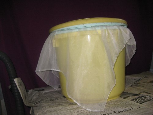 画面の上から蓋 ザル、割りばし 蜜搾り用布でザルそしてポリのタルです。1度の布濾しで完璧な蜜がとれます。