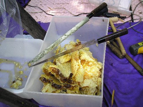 別の容器に採取した巣板付きの蜜が入っている。